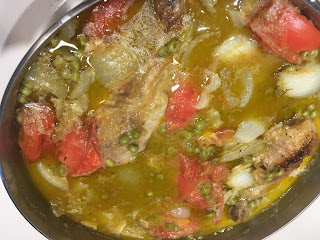 Start onions, peppers, tomatoes in a pan. Add curry paste(I use maesri) and cook down. Add can of coconut milk. Add a little water if necessary. Dump in can of peas and chicken once browned.